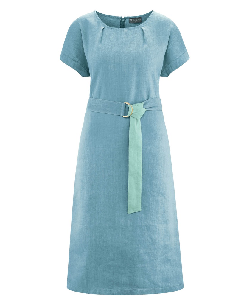 L'intramontabile abito midi con un tessuto favoloso all'80 % di canapa. Due possibilità per indossarlo grazie alla cintura bicolore: casual con la cintura e sportivo senza. La scollatura con le pieghe decorative da un tocco in più