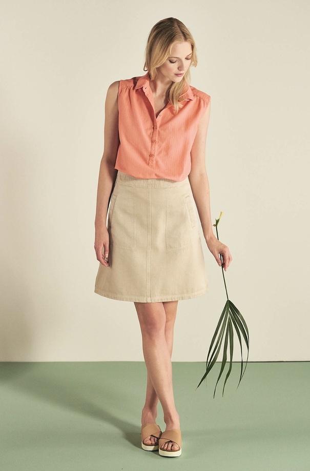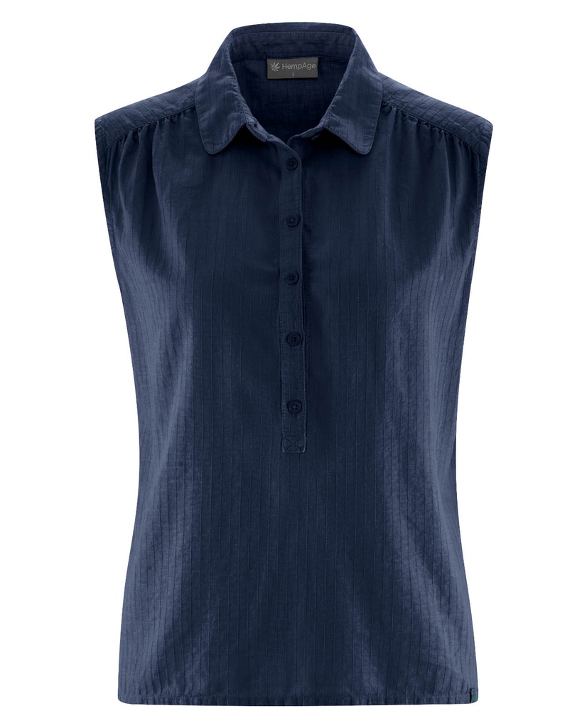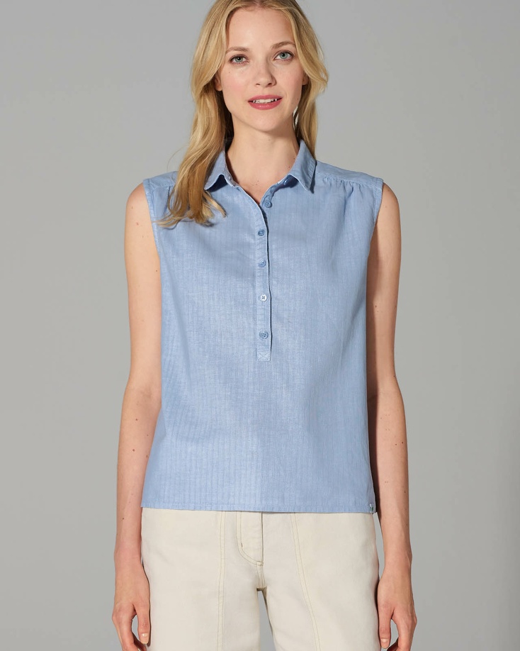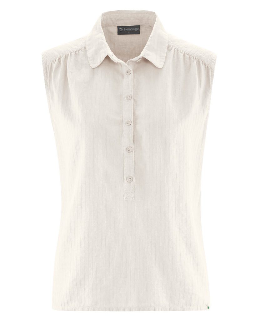 Un classico capo base per l'estate è la blusa senza maniche. Realizzato in canapa di alta qualità e cotone organico, ha un effetto rinfrescante. La zona delle spalle arricciata trasmette un aspetto giovane