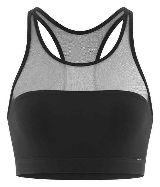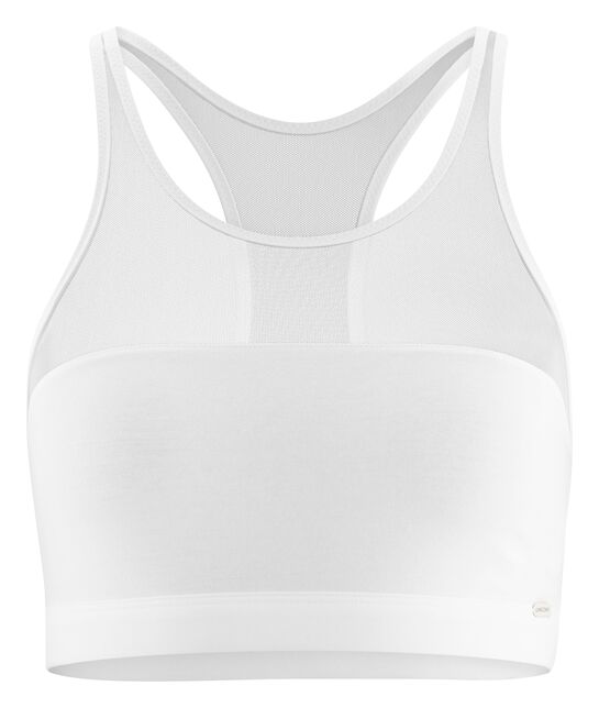 Gli inserti in tulle semitrasparente (74% poliammide (riciclato), 26% Elastan) sulle spalline e sulla schiena assicurano femminilità.