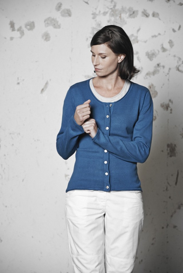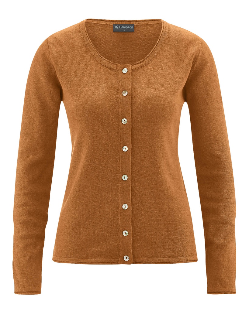 Cardigan girocollo, allacciatura con bottoni in madreperla, taglio normal fit, maglia sottile e confortevole, in tessuto di canapa riciclato, cotone riciclato, cotone biologico.