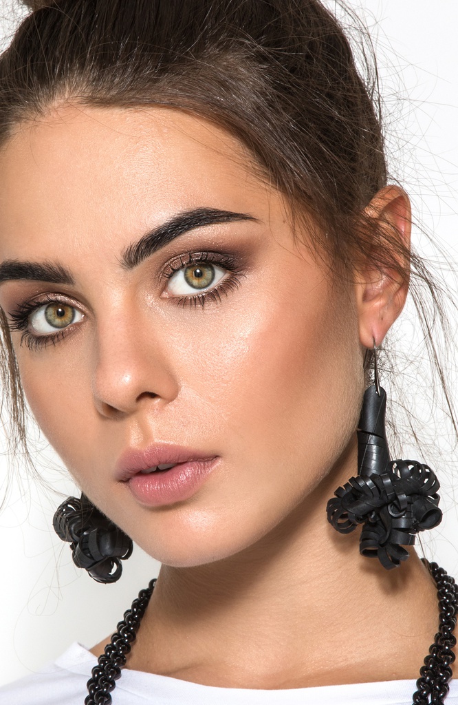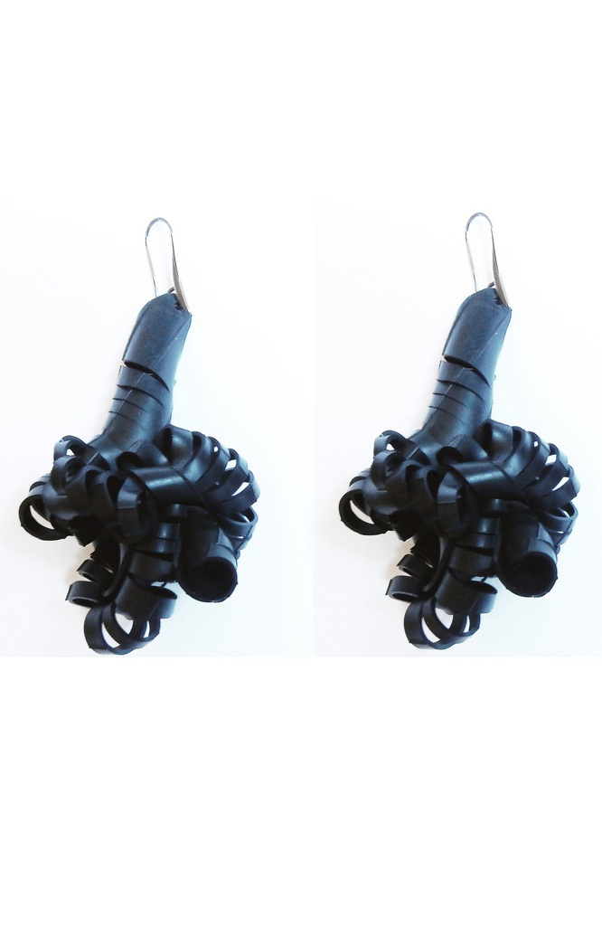 Orecchini formati da piccoli segmenti di camera d'aria riciclata che si intrecciano su stessi. Tagliati e cuciti interamente a mano in Italia. Le camere d'aria recuperate sono trattate con detergenti e prodotti specifici per la gomma prima della lavorazione. Gli accessori non si screpolano, non macchiano e non conservano l'odore originario del materiale.
