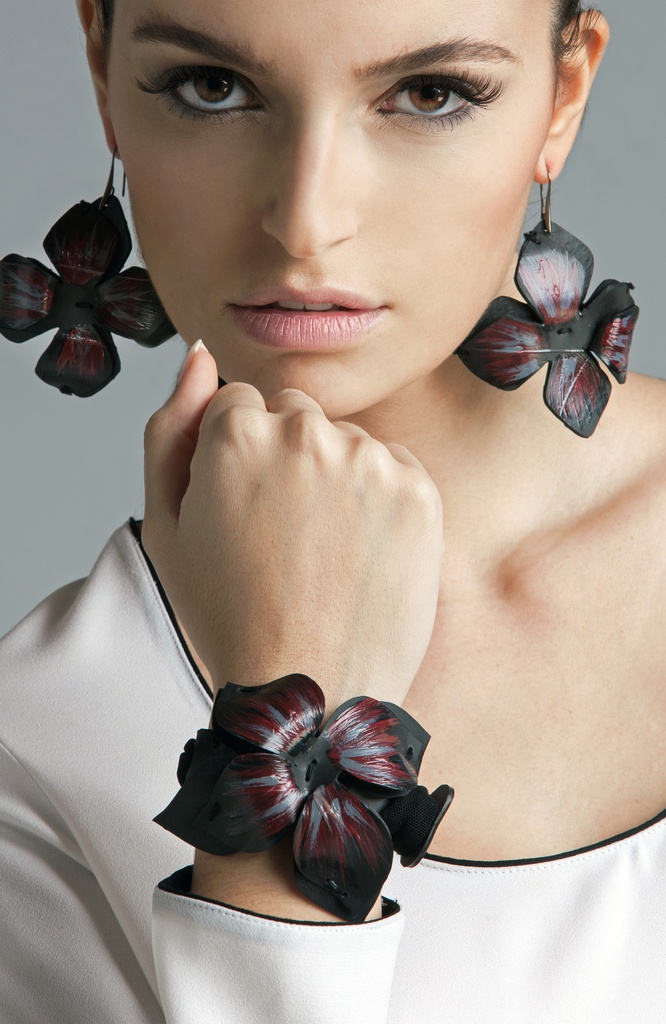 Bracciale in camera d'aria riciclata composto da un fiore di lillà. Tagliato, cucito e dipinto interamente a mano in Italia. Le camere d'aria recuperate sono trattate con detergenti e prodotti specifici per la gomma prima della lavorazione. Gli accessori non si screpolano, non macchiano e non conservano l'odore originario del materiale. Sono dipinti con colori a base d'acqua.