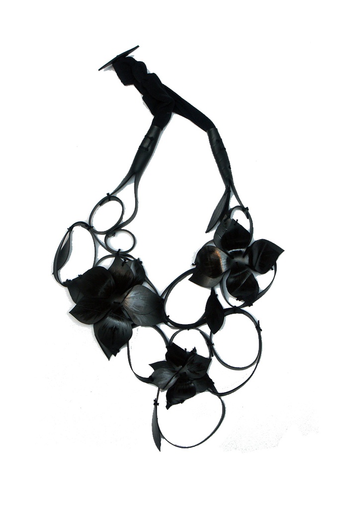 Collana realizzata in camera d'aria riciclata e composta da strisce assemblate in cerchi con applicazioni di fiori di lillà. Tagliata, cucita e dipinta interamente a mano in Italia. Le camere d'aria recuperate sono trattate con detergenti e prodotti specifici per la gomma prima della lavorazione. Gli accessori non si screpolano, non macchiano e non conservano l?odore originario del materiale. Sono dipinti con colori a base d'acqua.