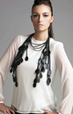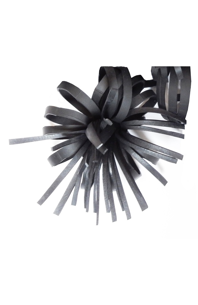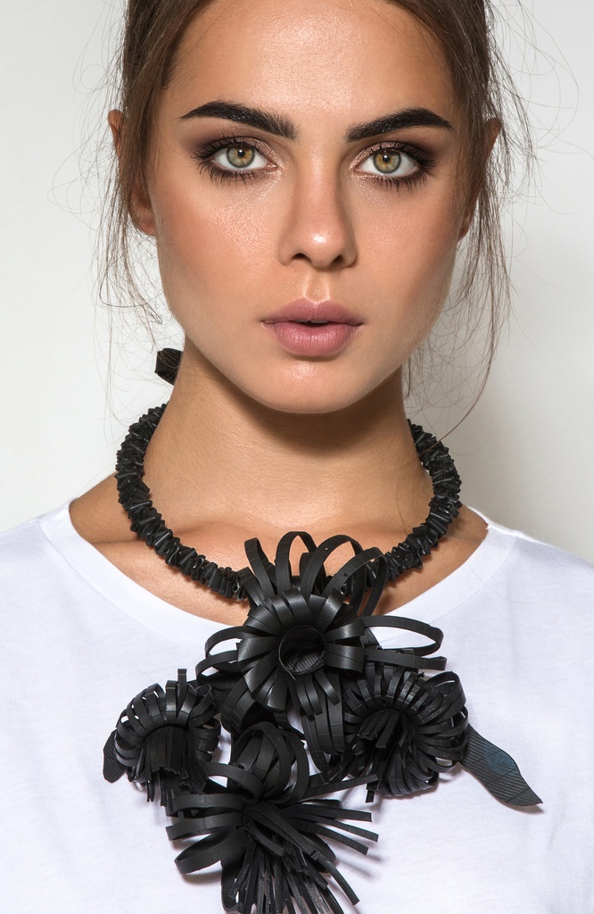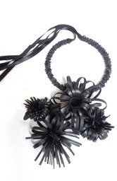 Collana formata da piccoli segmenti di camera d'aria riciclata che si intrecciano su stessi creando forme che ricordano fiori grandi e solari. Collare rigido in ottone foderato di camera d'aria drappeggiata.
