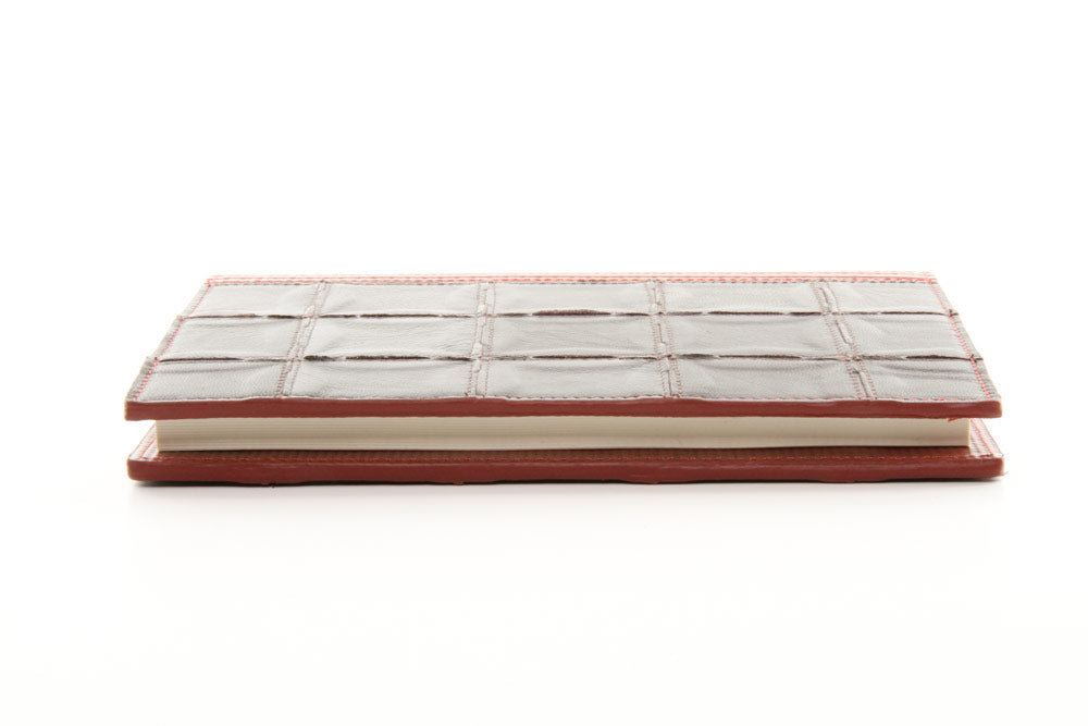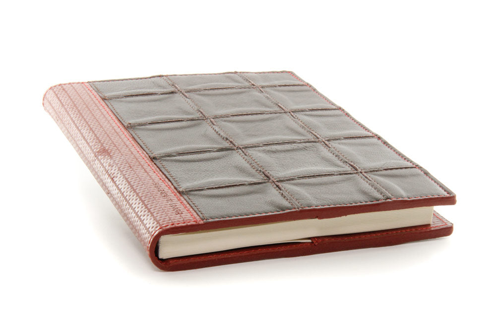La copertina del notebook Fire & Hide è rilegata nella nostra pelle recuperata intrecciata a mano e nella nostra manichetta antincendio dismessa.