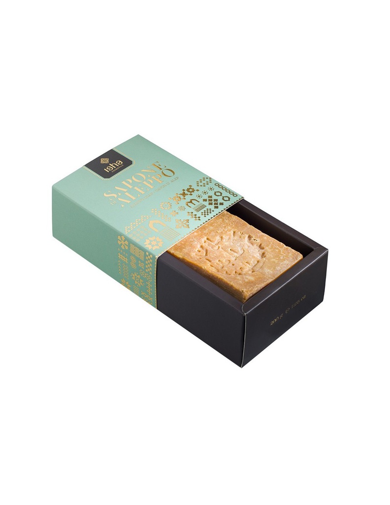 Realizzato artigianalmente ad Aleppo e stagionato naturalmente per minimo 12 mesi. Il 25% si riferisce alla massa totale degli oli saponificati.