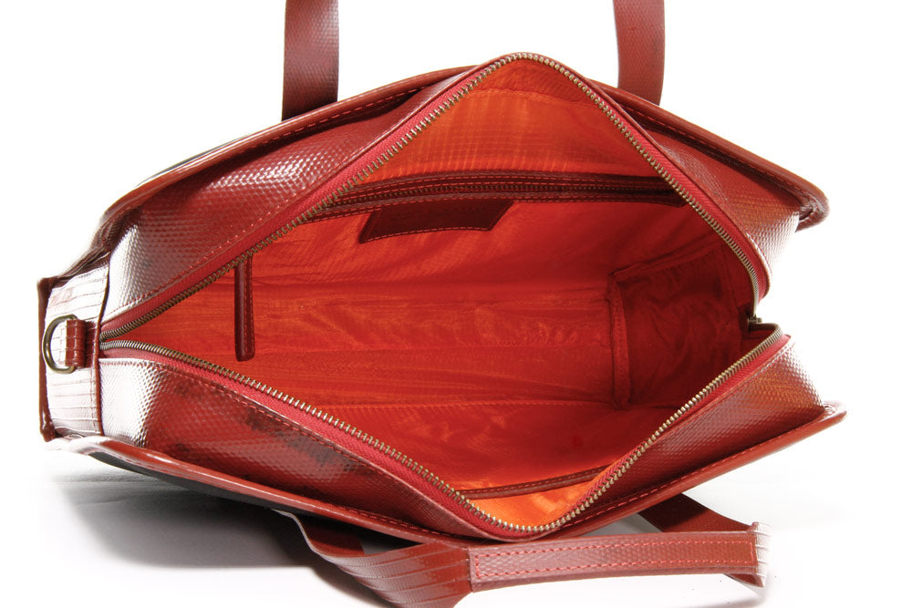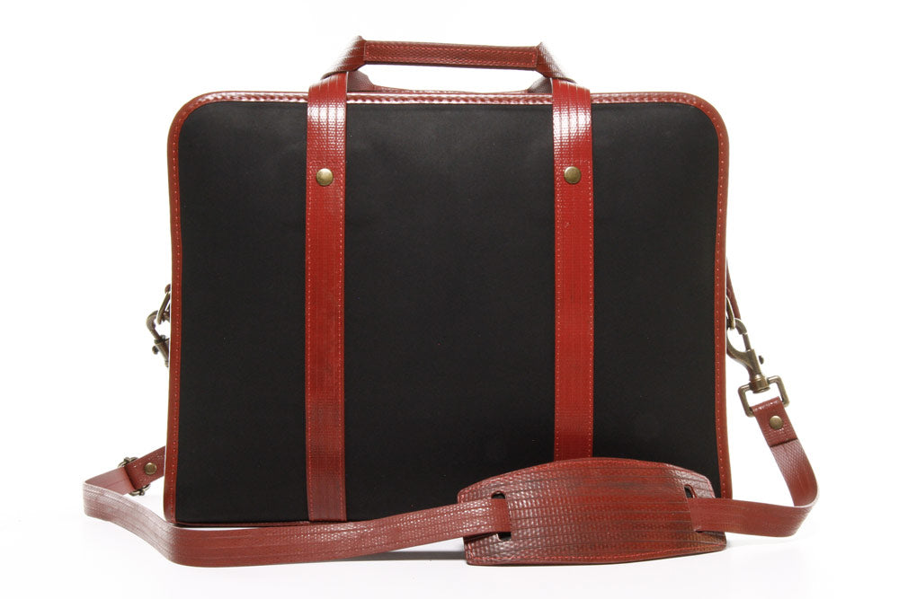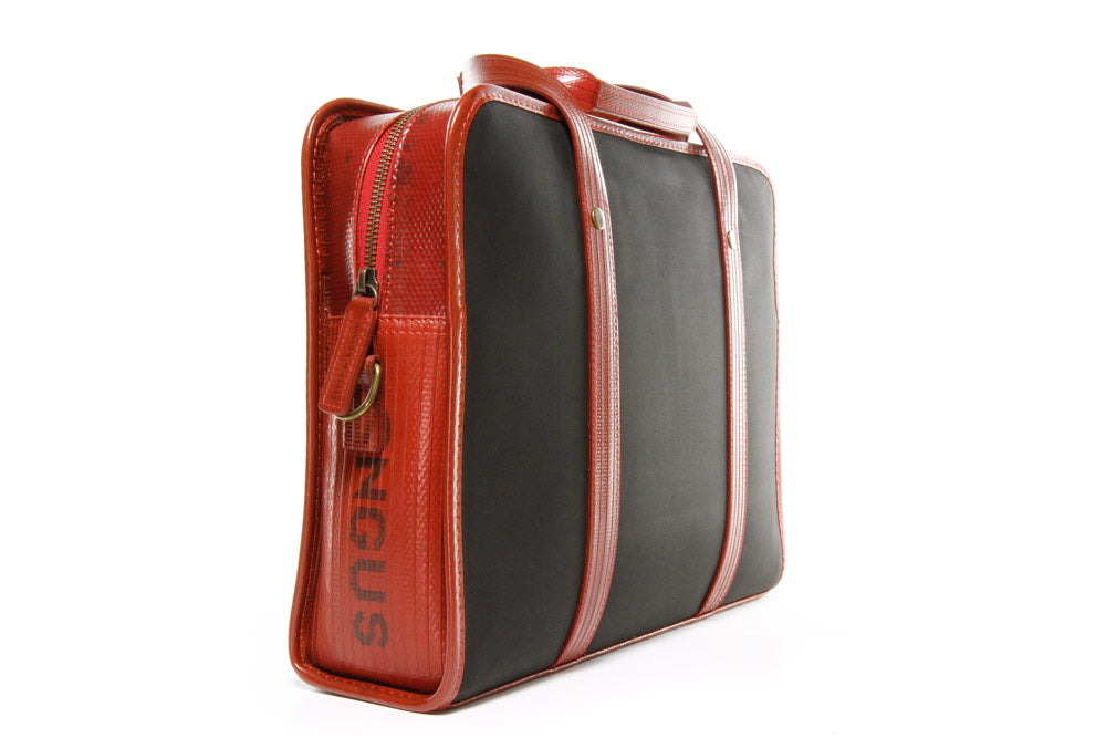 La valigetta compatta Elvis & Kresse è realizzata con una vera e propria manichetta antincendio e la fodera è in seta di paracadute militare rigenerata .