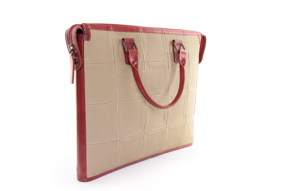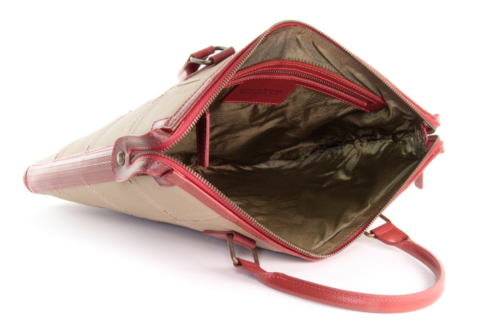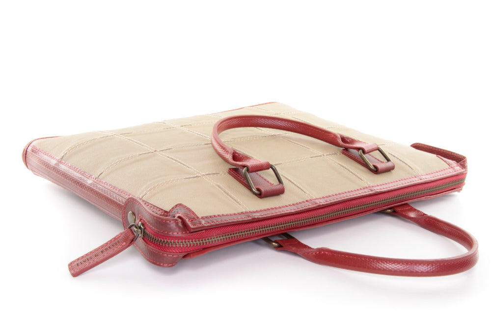 Questa è la Laptop Bag di Elvis & Kresse: una combinazione di robusta manichetta antincendio vintage e pelle Burberry recuperata intrecciata a mano. Il design elegante è perfetto per quando si desidera viaggiare leggeri in città. Puoi trasportare comodamente un laptop da 14" e la borsa ha un'ampia tasca interna con zip.