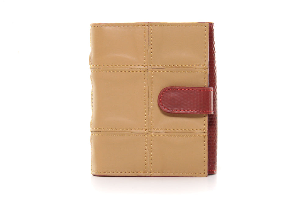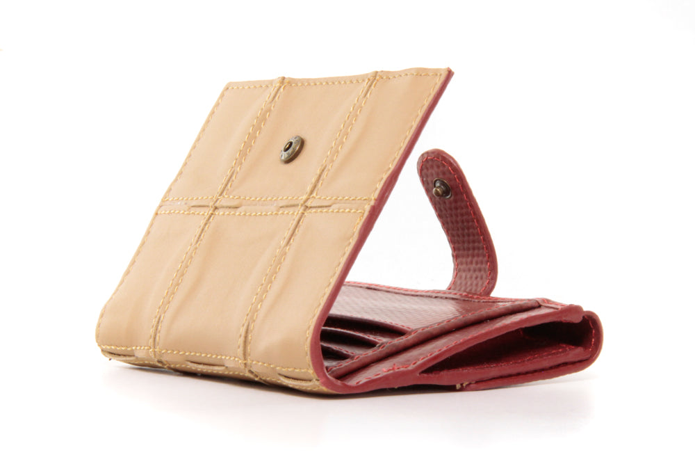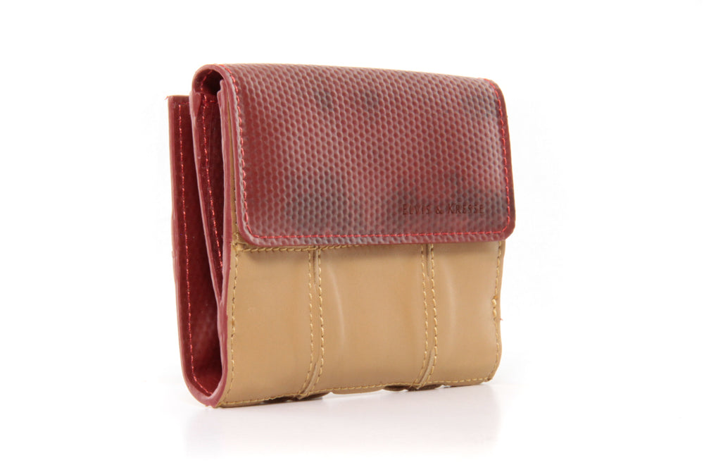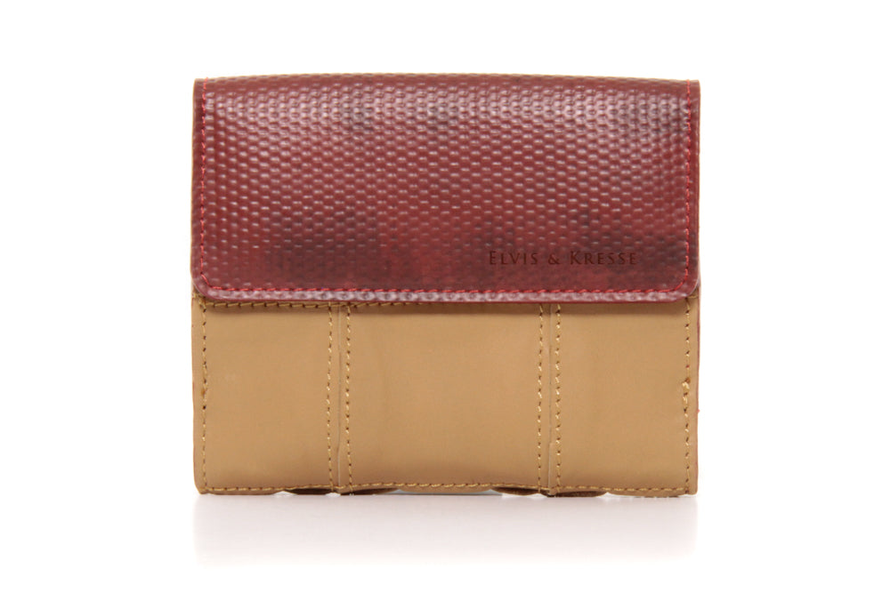 Il portafoglio pochette pieghevole Fire & Hide combina gli scarti del pellame Burberry recuperati e lavorati a mano e le manichette antincendio dismesse ed è foderata con seta da paracadute recuperata.