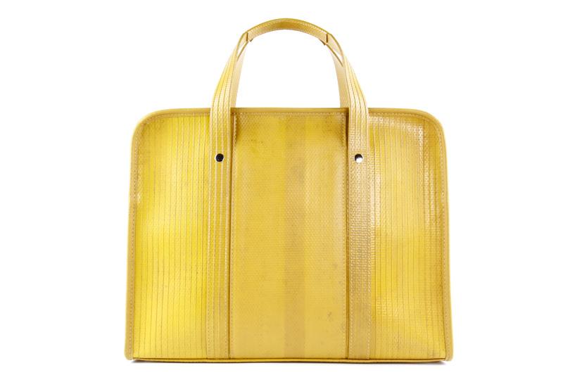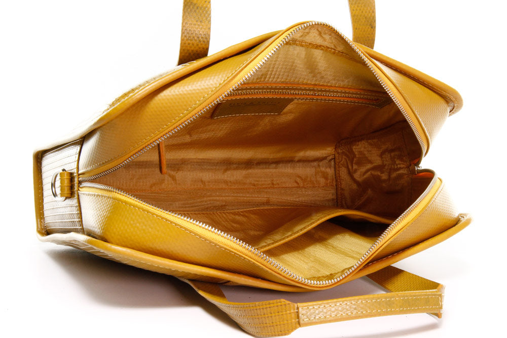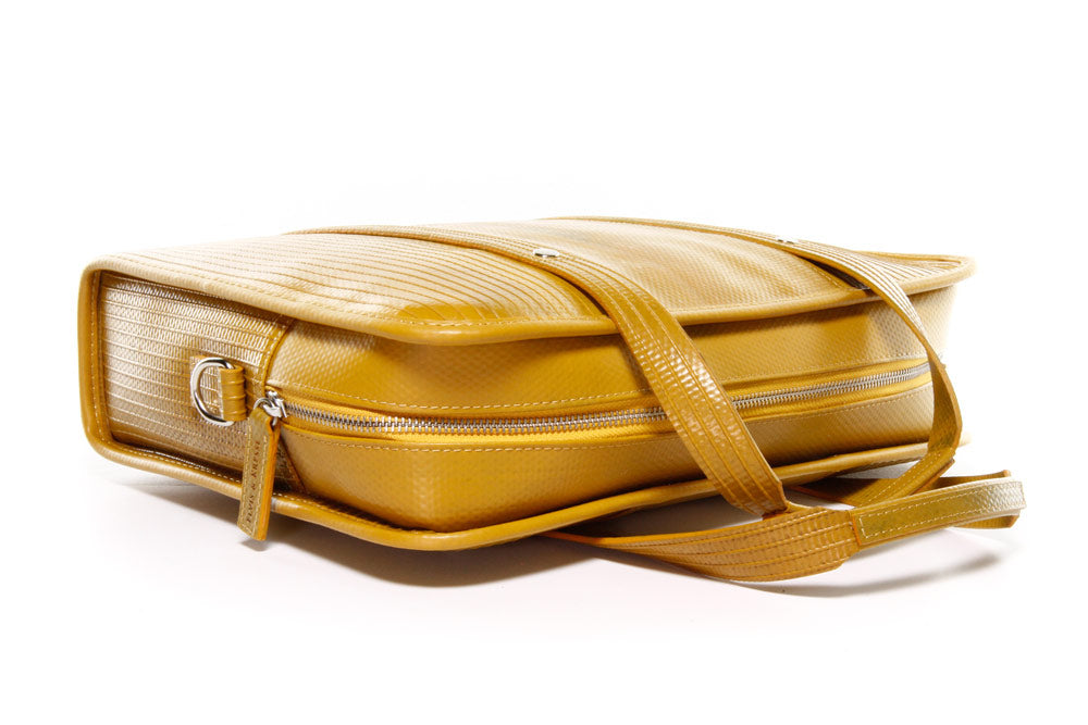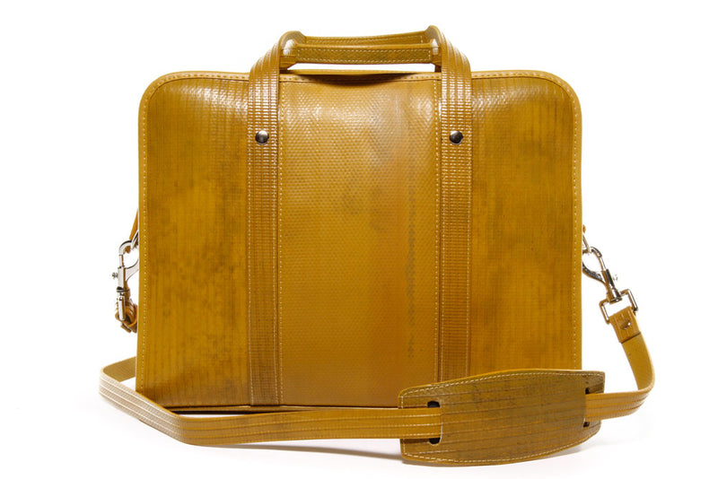 La valigetta compatta Elvis & Kresse è realizzata con una vera e propria manichetta antincendio e la fodera è in seta di paracadute militare rigenerata .