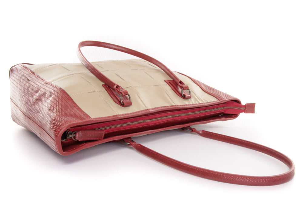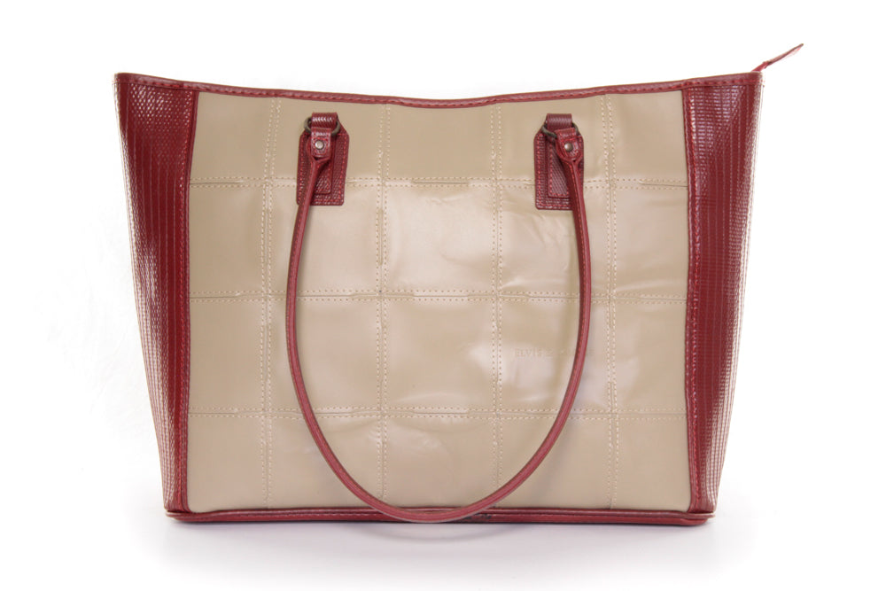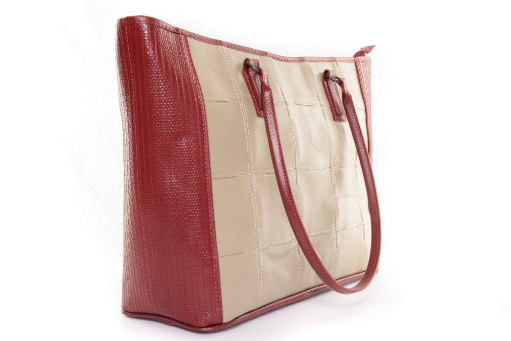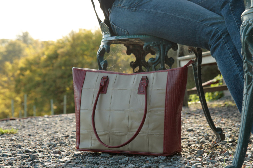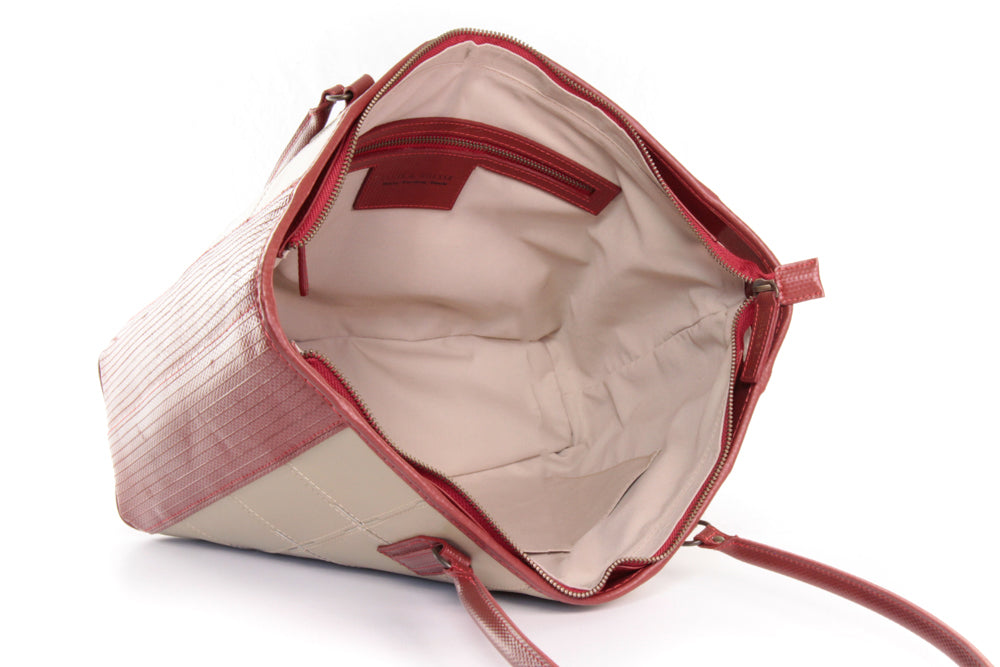 Il Fire & Hide Tote combina la pelle recuperata dai pellettieri britannici e il tubo antincendio arrivato a fine vita e recuperato, è rivestito con seta di paracadute recuperata.
