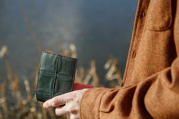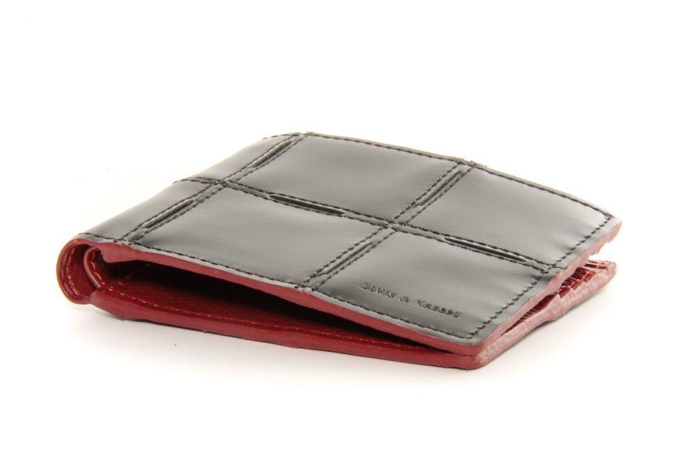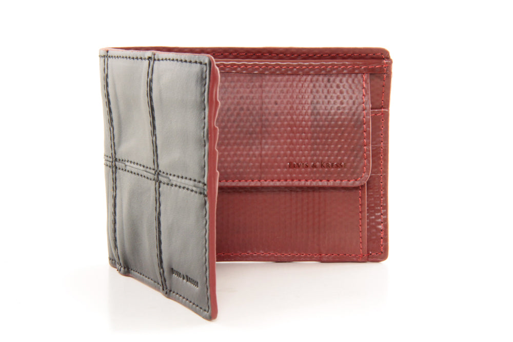 Il portafoglio Fire & Hide combina pelle recuperata intrecciata a mano e manichetta antincendio dismessa ed è foderato in seta paracadute recuperata.