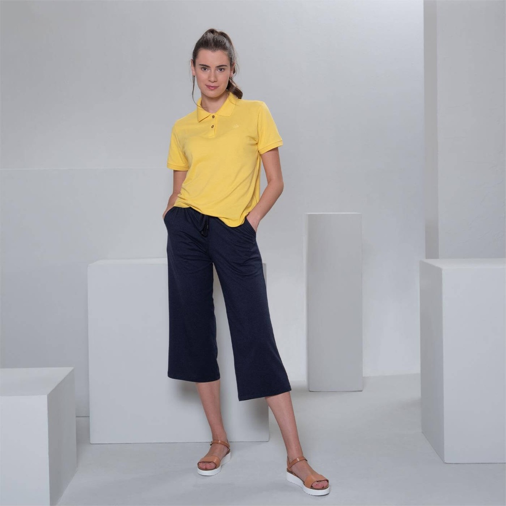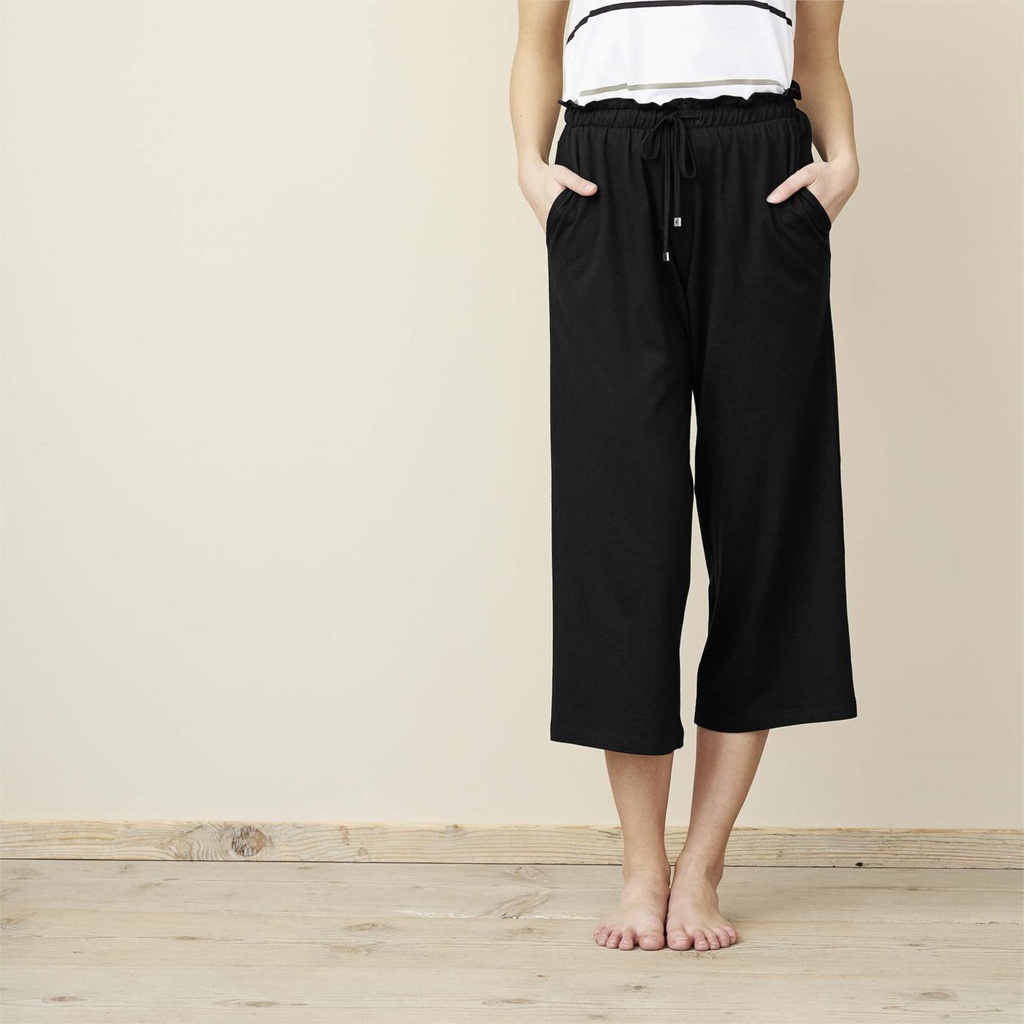 Eleganti, comodi, morbidi: questi pantaloni 7/8 in un moderno stile culotte colpiscono per il loro mix di materiali di alta qualità realizzato con un innovativo smusso di viscosa di bambù, grandi proprietà e un aspetto elegante. I pantaloni sono larghi e hanno una fascia elastica interna. La larghezza può essere regolata perfettamente usando la coluisse con estremità metalliche.