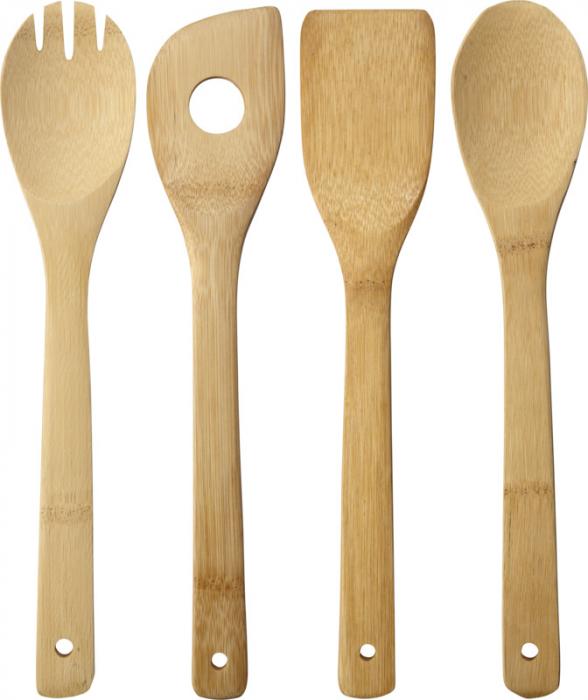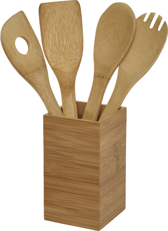 Set 4 pezzi utensili da cucina con supporto. Questo set include cucchiaio, spatola, cucchiaio con foro, forchettone che possono essere inseriti nel contenitore in bamboo.