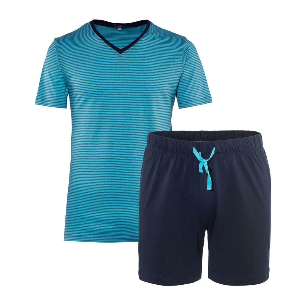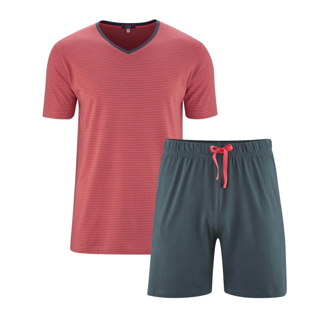 Questo comodo pigiama completo in due pezzi è il tuo compagno semplice e affidabile nelle notti calde: Realizzato in pregiato cotone biologico con lavorazione single jersey, questo pigiama con il pantaloncino corto e la maglia con scollo a V, si adagia comodamente e dolcemente sulla tua pelle e la lascia respirare, in modo che anche tu non sudi a temperature più elevate.