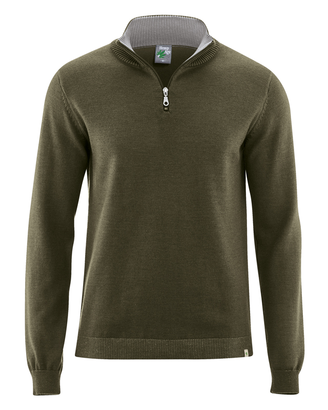 Taglio classico con collo leggermente alto e cerniera. L'interno del colletto è in un colore più chiaro e in un filo che non contiene lana.