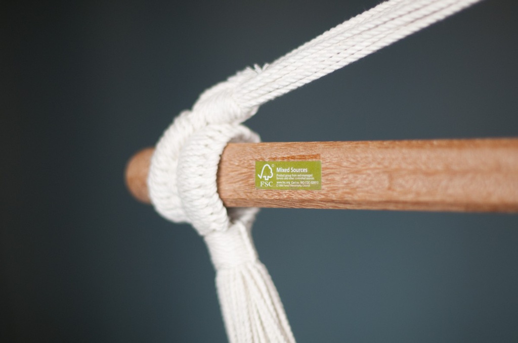 DESCRIZIONE: del materiale: 100% cotone | sospensione: 50% cotone, 50% poliestere | perno: acciaio inossidabile | barra di distensione: bamboo (FSC certificato)