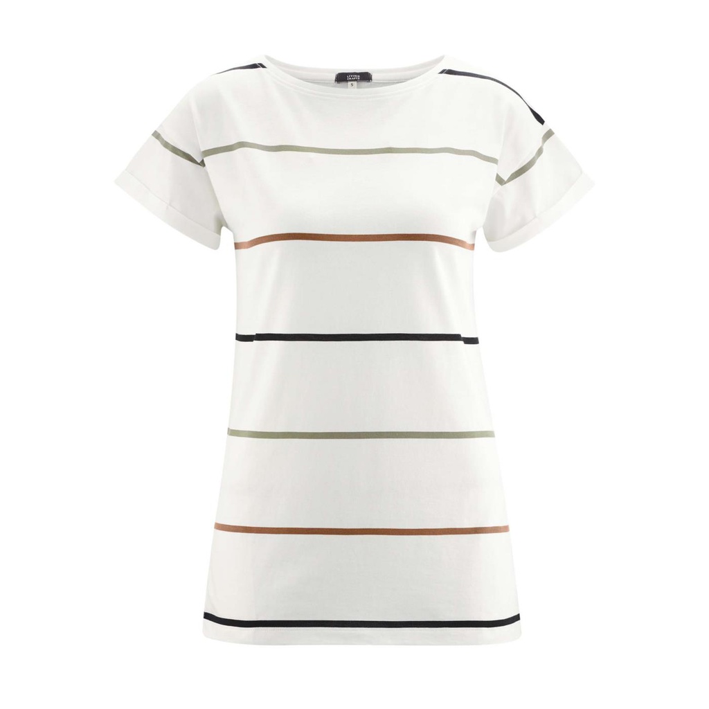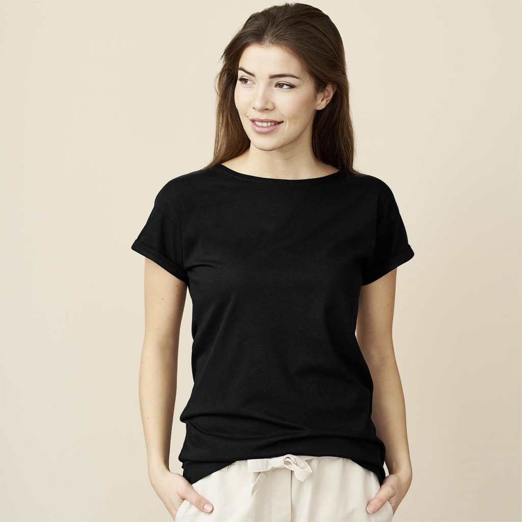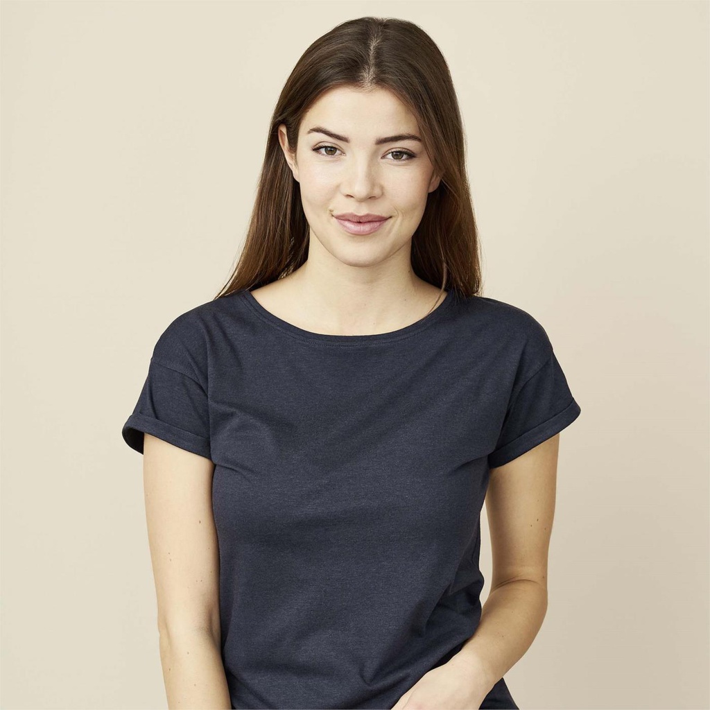 La maglietta girocollo ha maniche strette, polsini e spacchi laterali. La T-shirt è? particolarmente sostenibile per i suoi valori interiori, perchè è realizzata in fibra di viscosa di bambù sostenibile.